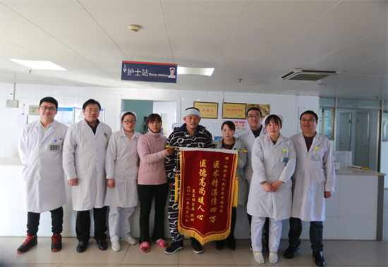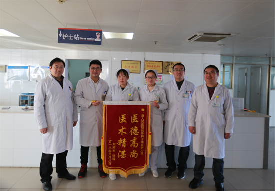 另一位患者邱某某,女性,70岁,泗洪县归仁人,因“突发不能言语继人事不知1小时”入院,患者生命体征非常微弱,生命垂危。经检查脑内血肿100ml以上,副主任医师汪方正主任及刘瑞医师立即进行“开颅减压血肿清除术”,医护人员通力合作、密切配合,快速给予脱水、降颅压、利尿、控制血压。经过长达2小时抢救,我院医护人员终于把这名患者的生命从死神手中拉了回来。术后复查CT提示颅内血肿完全清除,经过苏桂芳护士长及其护士团队精心护理下,患者逐渐康复。在患者出院之际,家属送来两面锦旗,以表示衷心的感激。