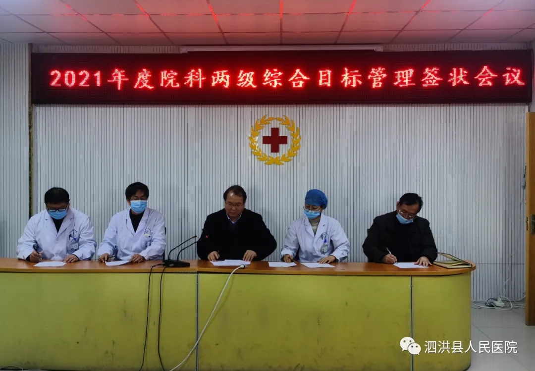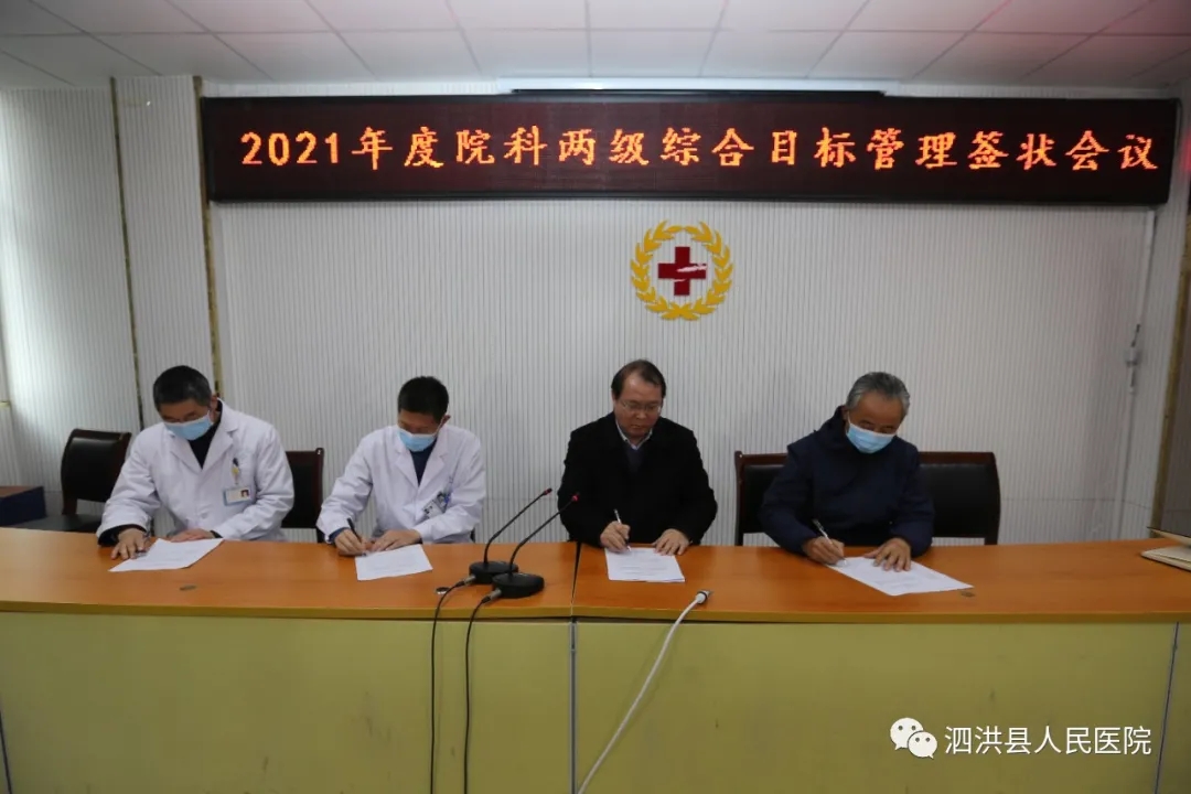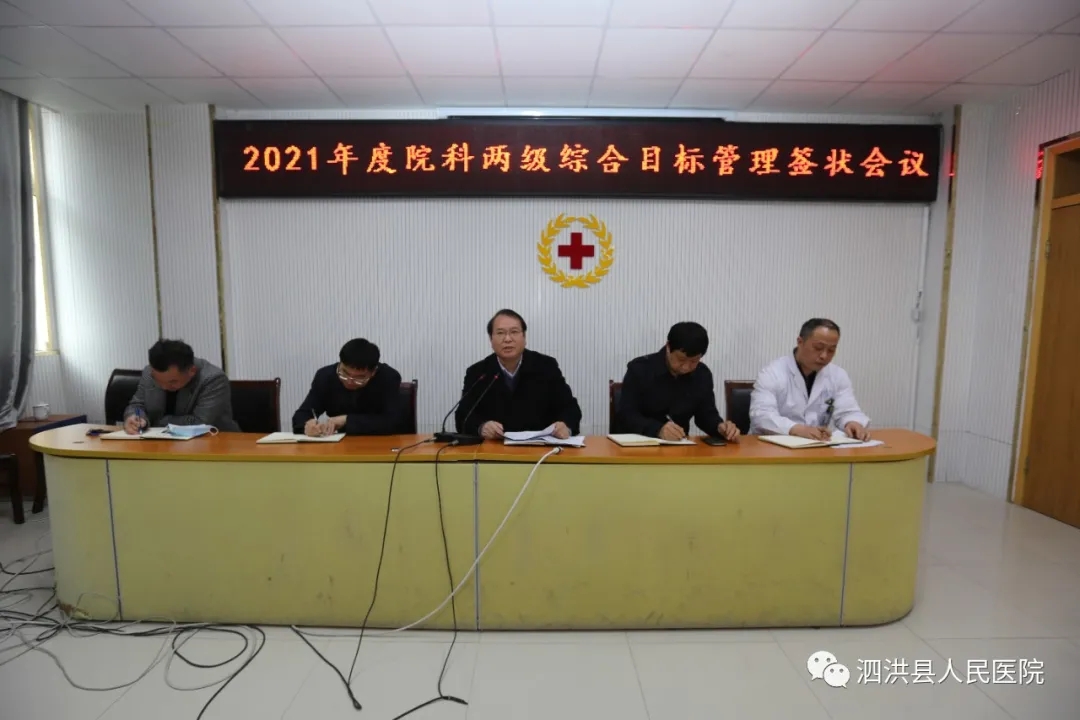 为加强医院全面质量管理,切实促进医院可持续发展,3月4日下午,院科两级综合目标管理签状会在我院综合楼第二会议室召开。洪医集团各位董事、县医院领导班子全体成员、全体中层干部参加了会议。