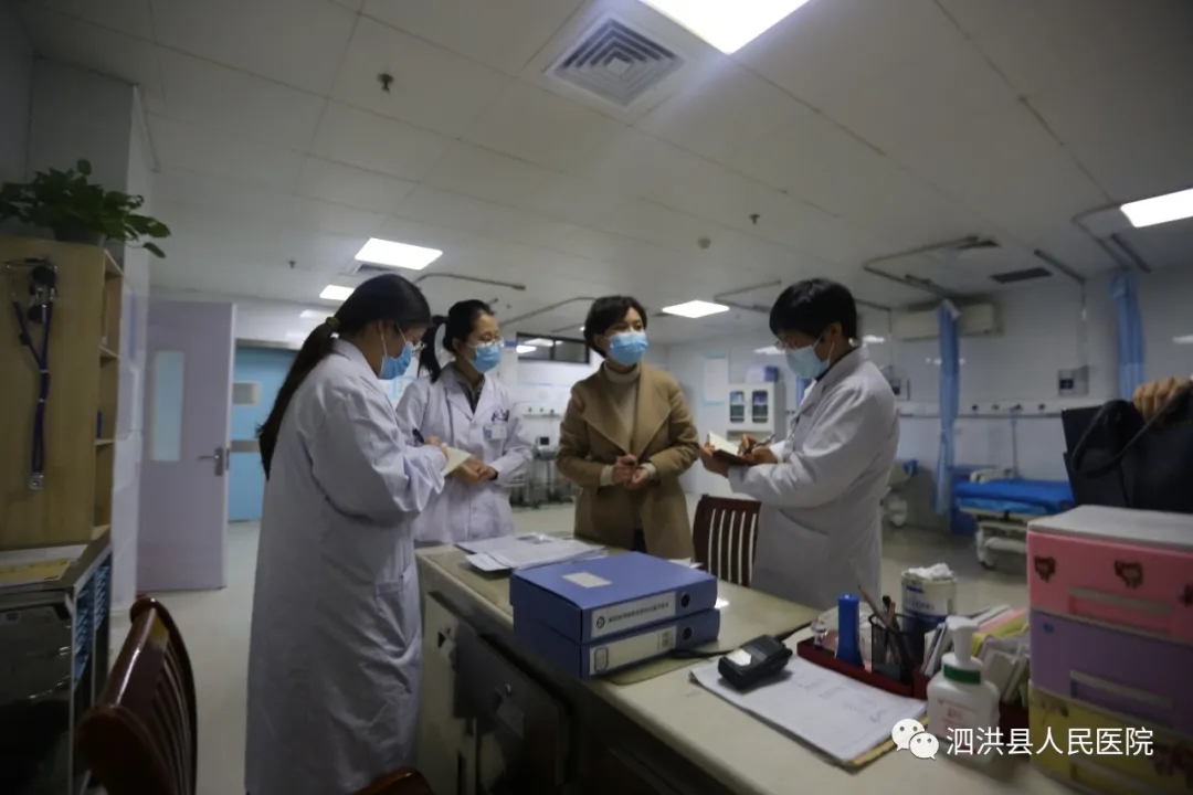 4月3日下午,由宿迁市第一人民医院专家陈义忠、杨茗岚,市医政科胡方顺等一行组成的督查组,到我院对新冠病毒疫苗接种医疗保障培训工作进行督查。洪医集团副董事长、泗洪县人民医院院长高明献和副院长孙士梅带领相关负责人陪同检查。