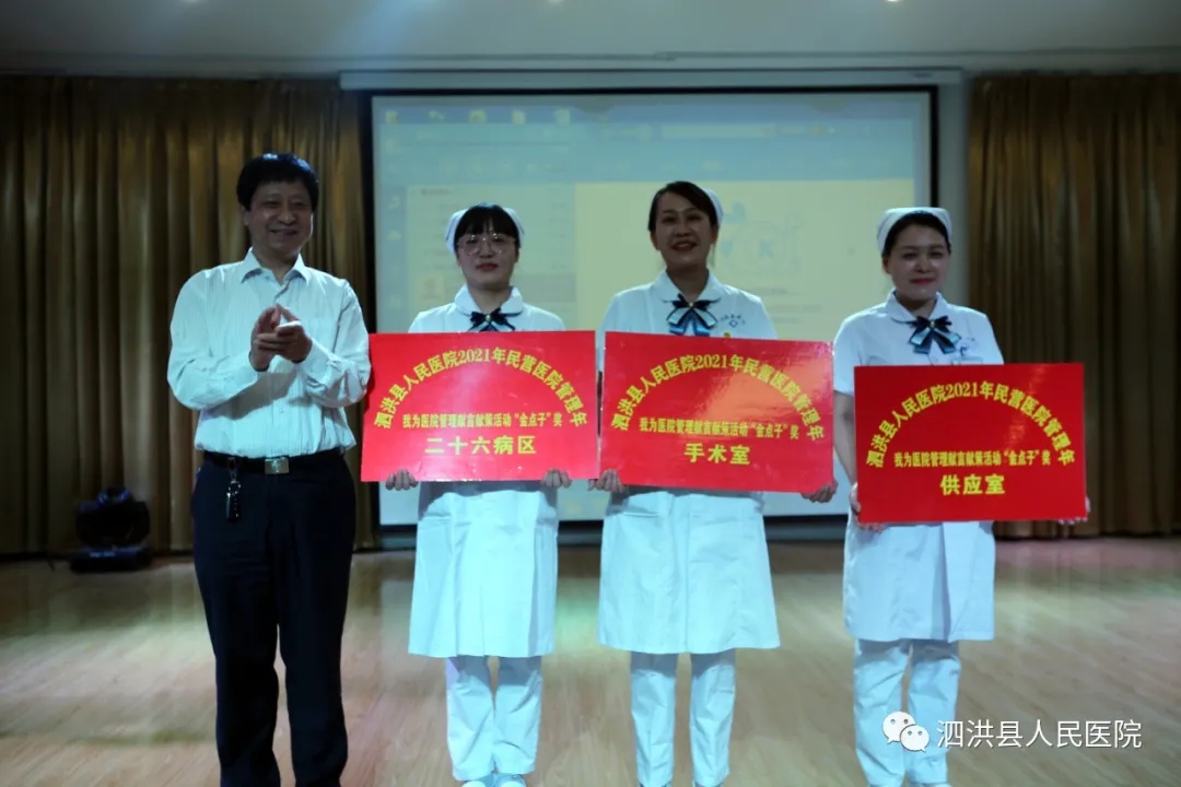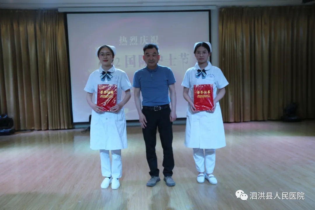 在演出期间集团领导分别为相关奖项颁发了奖牌和奖状。一是颁发的优秀护士长、优秀护士奖项。县医院有10名护士长,45名护士;中医院3名护士长、12名护士;泗洪双沟医院1名护士长、2名护士受到表彰。二是颁发“我为医院管理献言献策”金点子建议活动奖项。县医院手术室、供应室、26病区获得金点子奖,县医院门诊部、14病区、17病区、24病区、30病区获得献言献策奖。此外还颁发了鼻饲技术护理技能竞赛奖项。