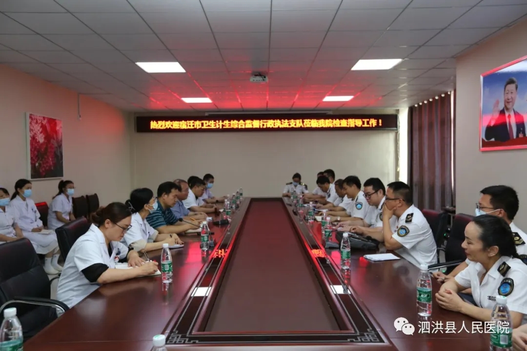 7月15日,由宿迁市卫生计生综合监督行政执法支队队长汪爱年带队,在泗洪县卫计综合监督执法大队长付小永的陪同下,到我院检查指导工作。洪医集团副董事长、泗洪县人民医院院长高明献及相关负责人陪同检查。