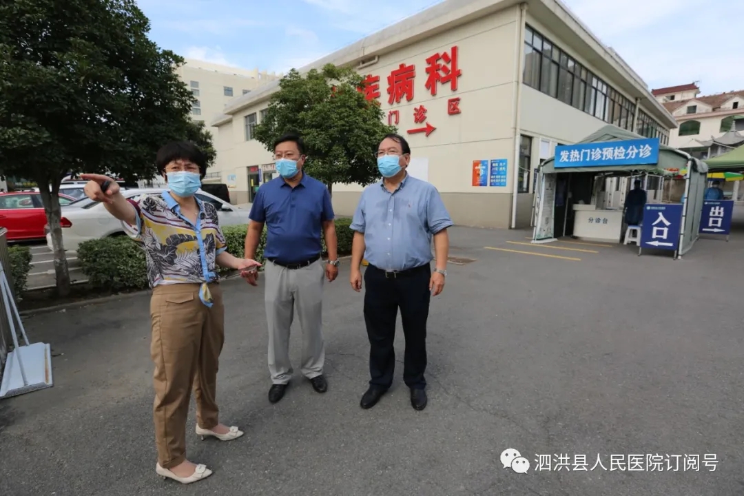 导读:8月16日下午,县卫健局副局长谭苏洪到我院督导检查疫情防控工作。洪医集团副董事长、泗洪县人民医院院长高明献,副院长陈虎及相关职能部门负责人陪同检查。谭副局长先后实地查看了我院预检分诊处、发热门诊、内科楼等重