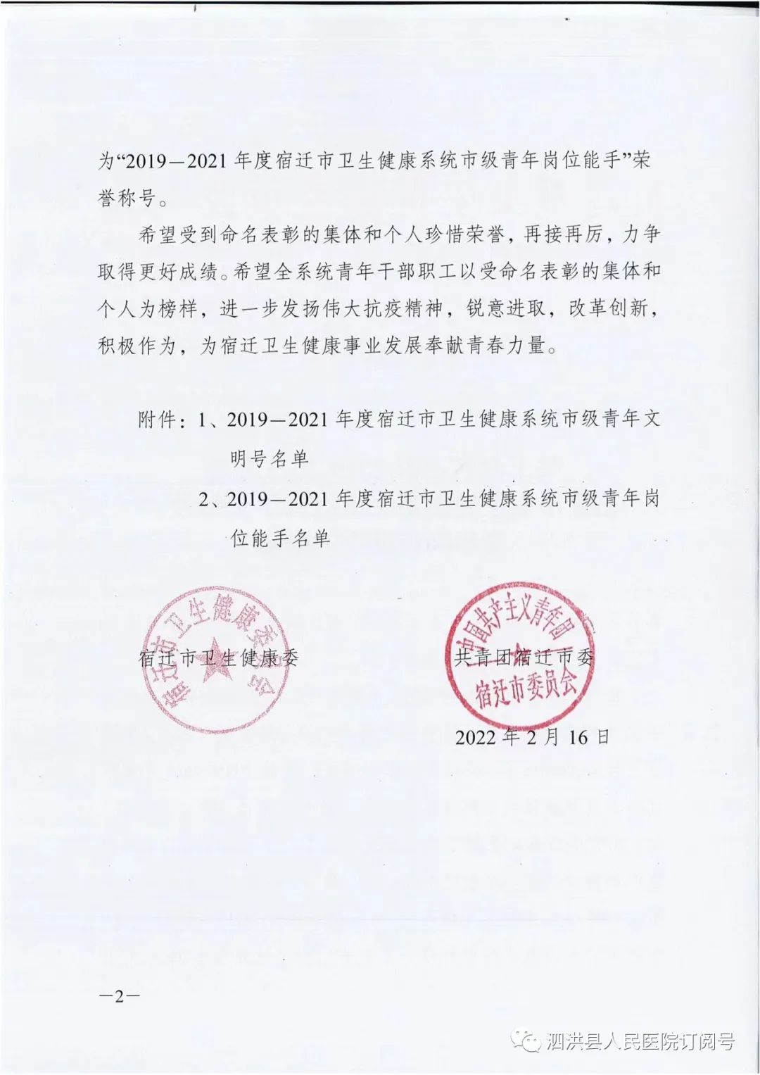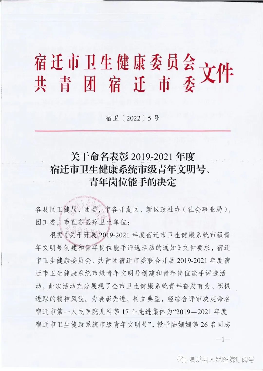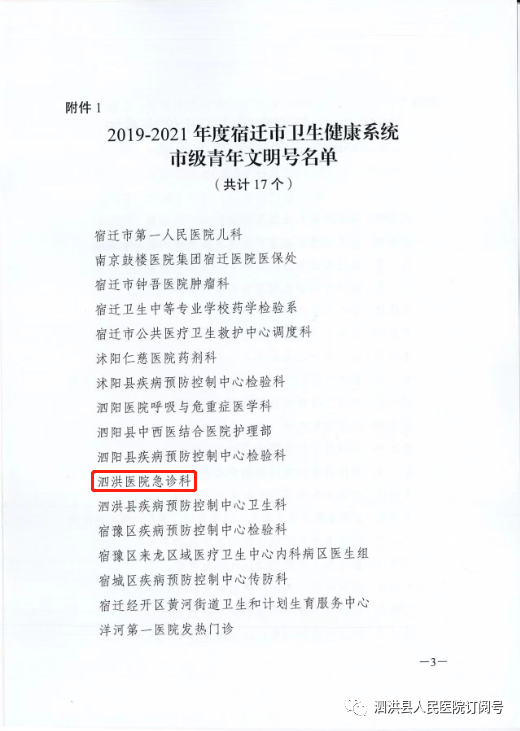 近日,宿迁市卫生健康委员会、共青团宿迁市委员会下发关于命名表彰2019-2021年度宿迁市卫生健康系统市级青年文明号、青年岗位能手的决定。我院急诊科被评选为宿迁市卫生健康系统青年文明号。