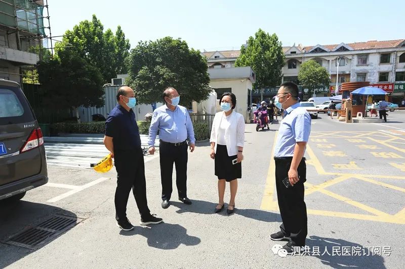 6月8日上午,泗洪县卫健局局长胡竹芳、卫健局党委委员刘修凯等到我院视察发热门诊建设及疫情防控工作。洪医集团副董事长、泗洪医院院长高明献、副院长董红军等陪同检查。