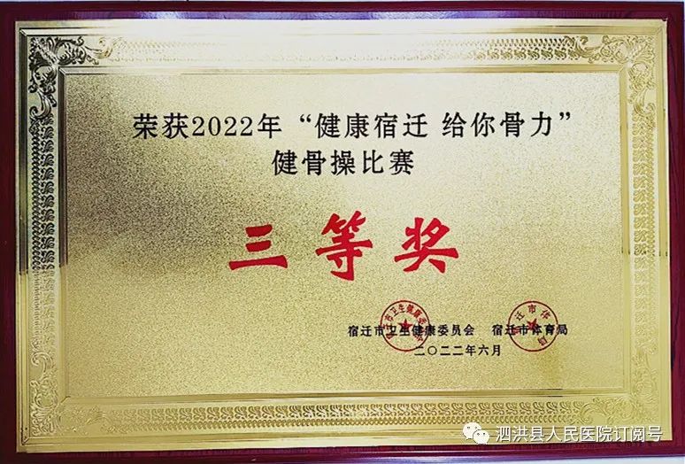 6月14日上午,在由宿迁市卫健委举办的全市卫健系统健骨操比赛中,泗洪医院表演队在参赛的12支代表队中脱颖而出,荣获三等奖。